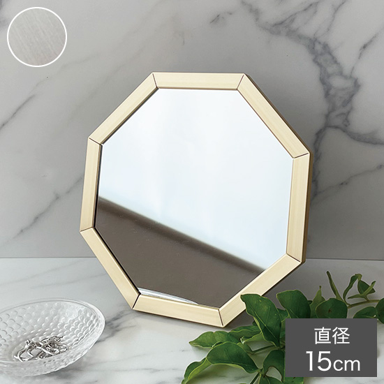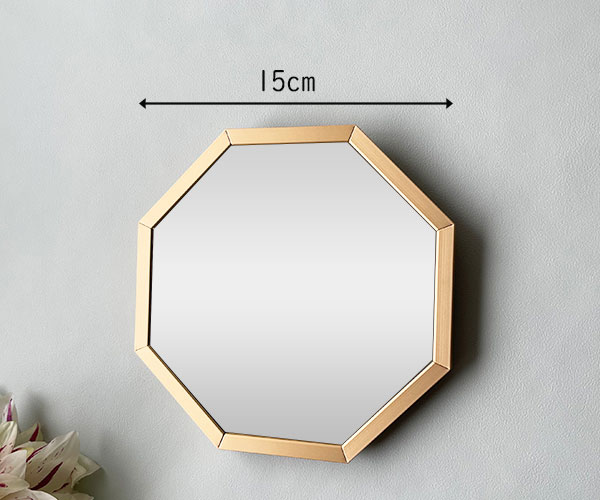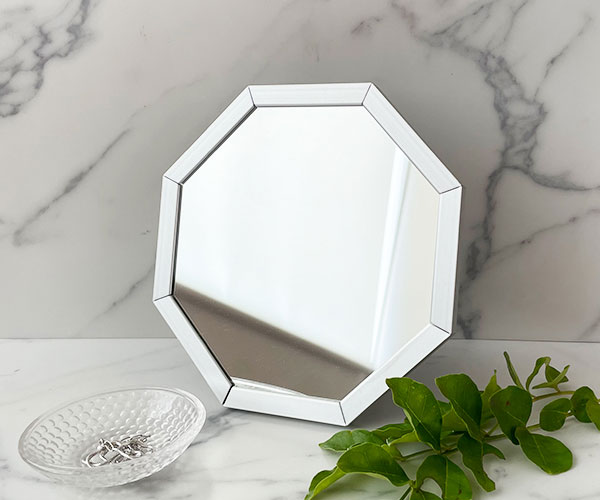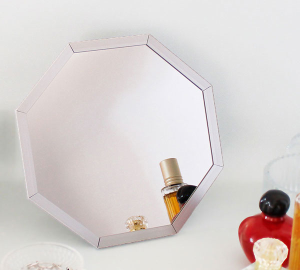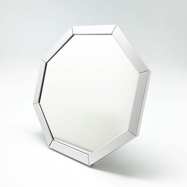 スタンド式と壁掛け式、両方可能な八角形のミラー(約15cmサイズ)です。