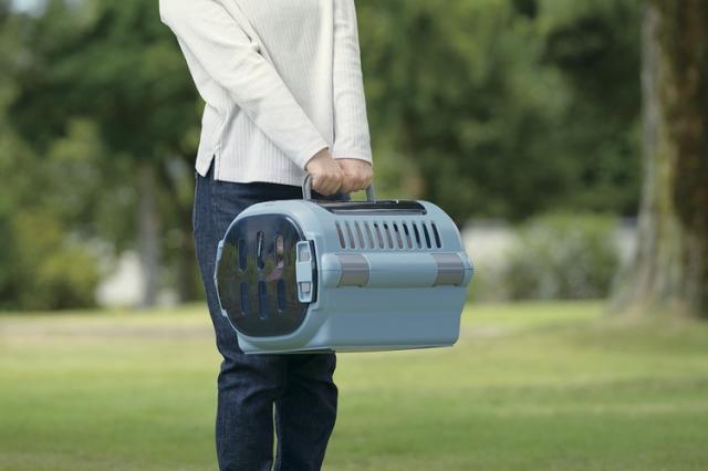 天面のトップドアからペットをラクに出し入れできます。別売りの「ウォーターノズル キャリー用」が取り付けられるので、キャリーの中でも給水が可能。幅が広めのワイドなハンドルは両手でも持てるので、女性でも安定して持ち運びができます。