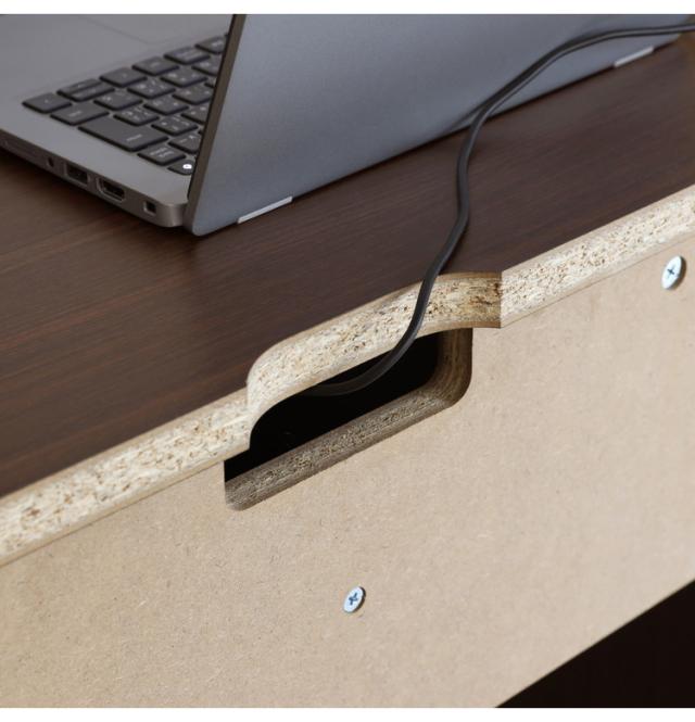 天板には配線を通す加工があるので、パソコンなどの配線を後ろに通してすっきりまとめることができます。