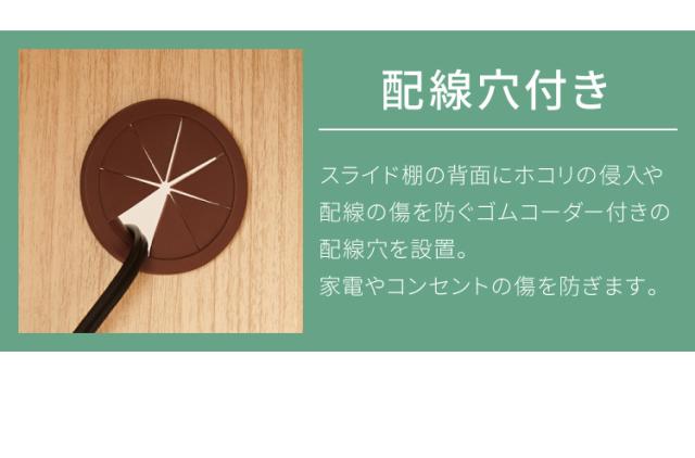 手前に引き出せるスライドテーブルには、炊飯器などを置くと便利です。家電の配線を通せるゴムコーダー付きの配線穴もついています。