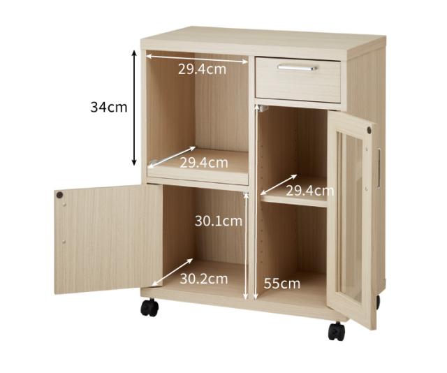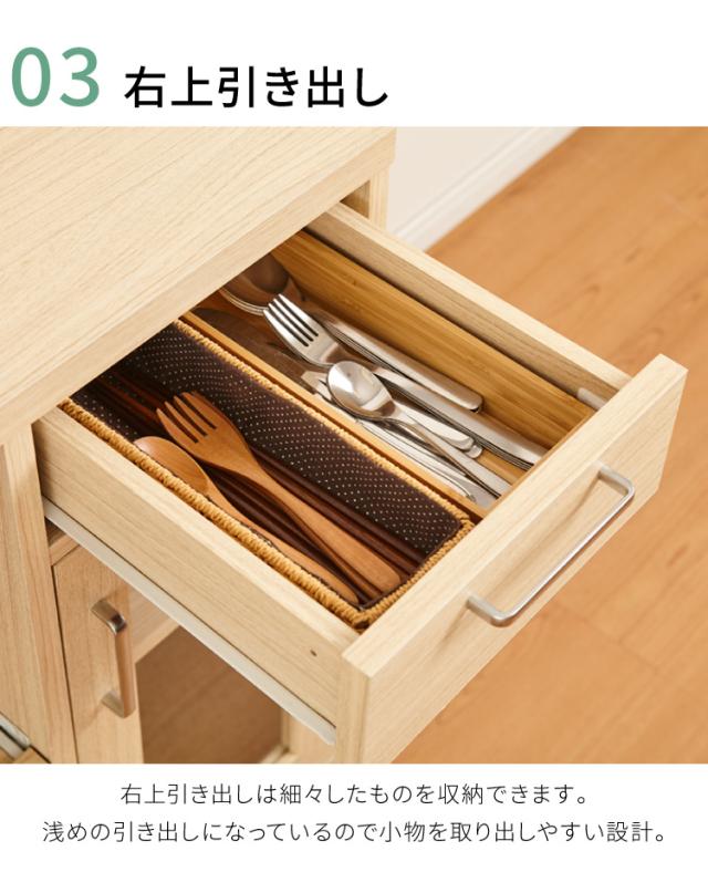 引き出しは1杯付き。カトラリーや布巾などの収納に最適です。移動に便利なキャスター付き。