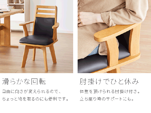 チェアには肘が付いており、360度回転するので、立ったり座ったりがラクに行えます。