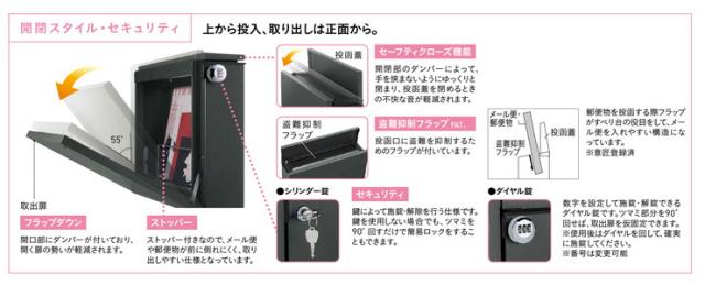 投函口に盗難を抑制するための盗難抑制フラップが付いています。郵便物を投函する際フラップがすべり台の役目をして、メール便を入れやすい構造になっています(意匠登録済)。セキュリティ:鍵によって施錠・解錠を行う仕様です。鍵を使用しない場合でも、ツマミを90°回すだけで簡易ロックをすることもできます。