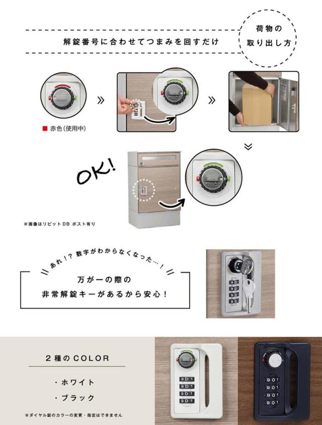荷物の受け取りは宅配業者が任意で暗証番号を設定するダイヤル錠式。