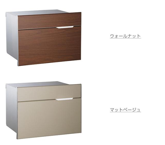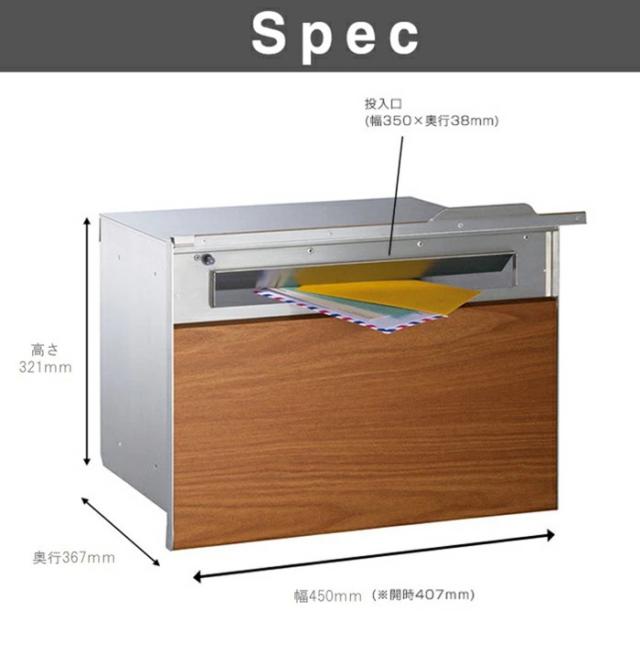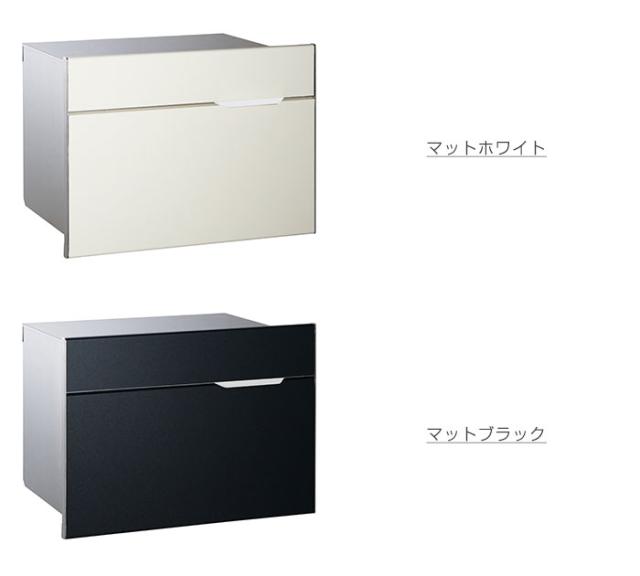 建築デザインを引き立てる、埋め込みタイプのメール便ポスト。シンプルでムダのないデザインが、建物と調和しながらメール便が受け取れる、機能性を併せ持ちます。 仕様:正面から投入、取り出しは背面から。 特徴:W340×L260×t35mmのメール便の投函・取り出しが可能。投函口に盗難を抑制するためのフラップが付いています。ダイヤル錠で郵便物やメール便を安全に受け取れます。開閉部のダンパーによって、手を挟まないようにゆっくりと閉まり、投函口の蓋を閉める時の不快な音が軽減されます(セーフティクローズ機能)。 注意点:ポスト側面にある溶接痕および位置決めのためのダボ穴は、部品を取り付ける際に発生するもので商品不良ではございませんのでご了承ください。ポスト前面部、本体部底面の水抜き穴をふさがないで下さい。ポスト錠面のブロック積は3段までとしてください。水平に施工して下さい。ポストの変形、故障の原因となります。郵便物を取り出した際後は必ず蓋を閉めて施錠して下さい。郵便物が過度に多い場合や重量物の場合に投函口蓋が開いてしまう場合があります。 材質:[本体・取手]ステンレス[正面パネル]アルミ 重量:8.3