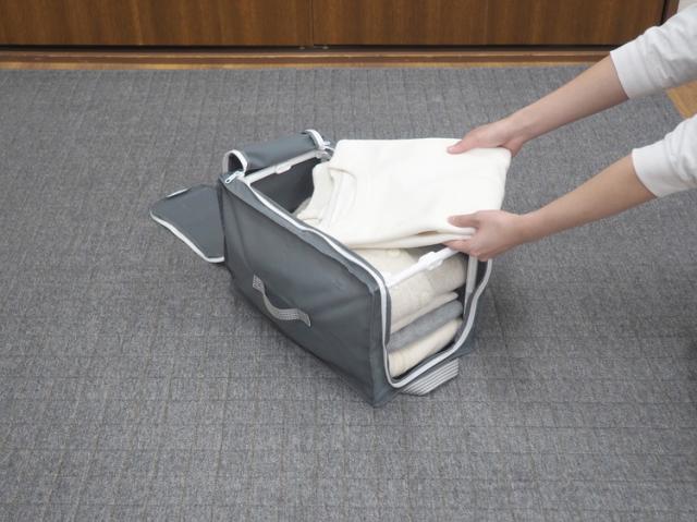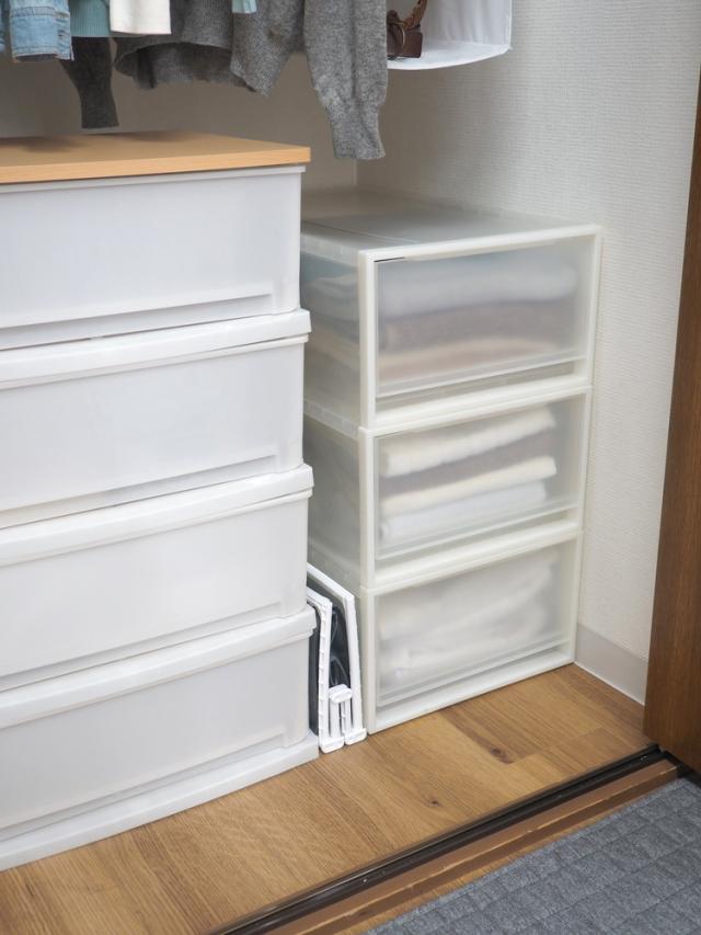 前面だけでもフタが開くから下の段の衣類も取り出せます。