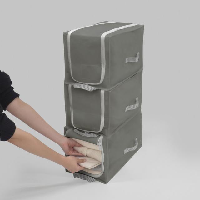 フレーム付きで積み重ね可能な衣類収納ケース。