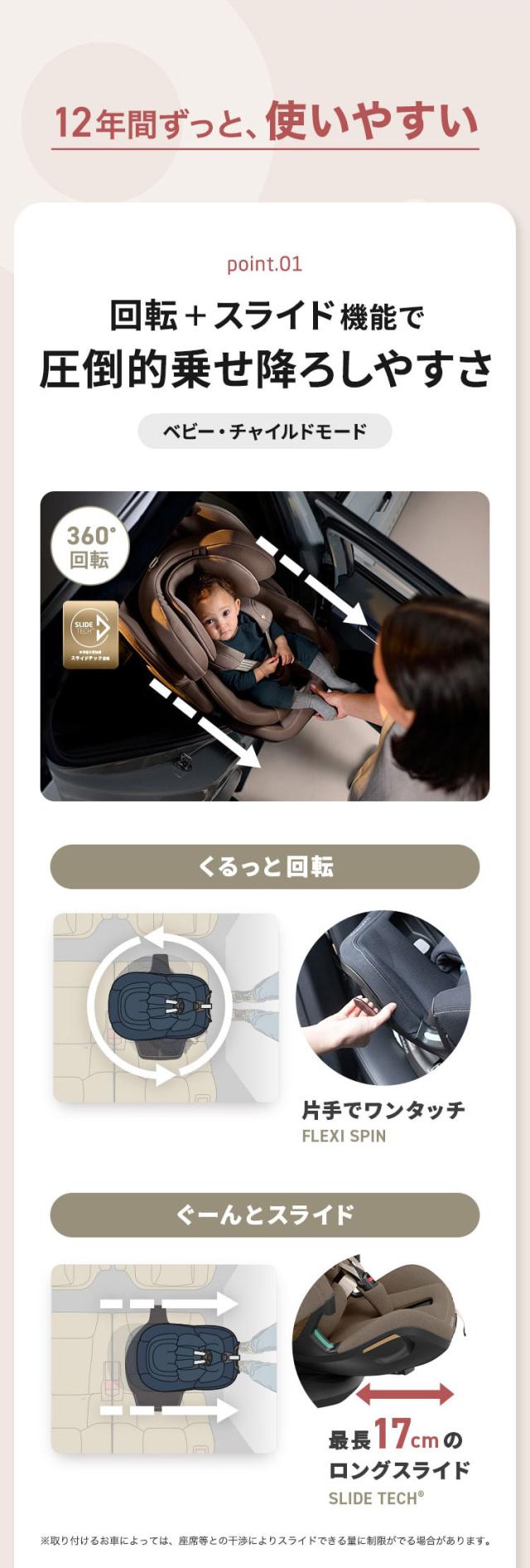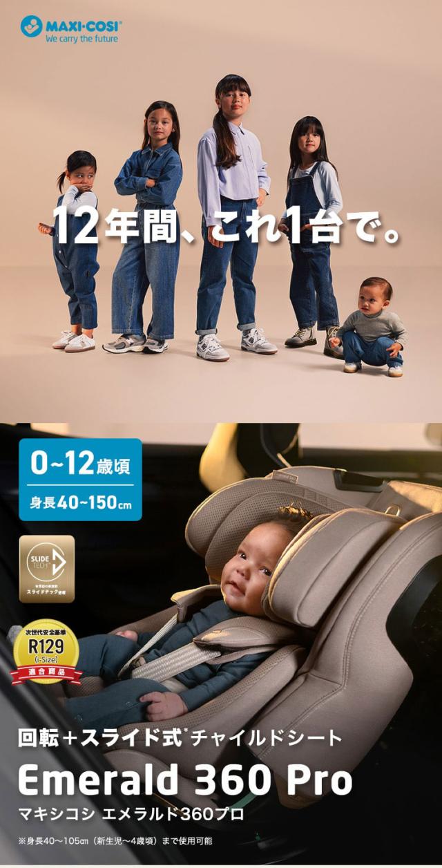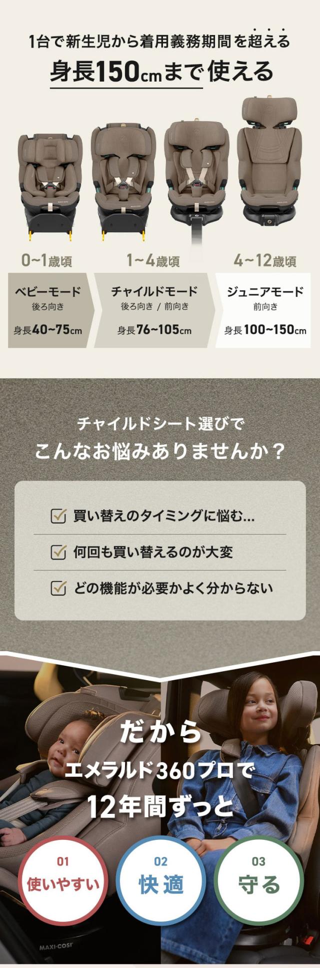 エメラルド360プロは、生まれてすぐの新生児からジュニアシート卒業の12歳まで、