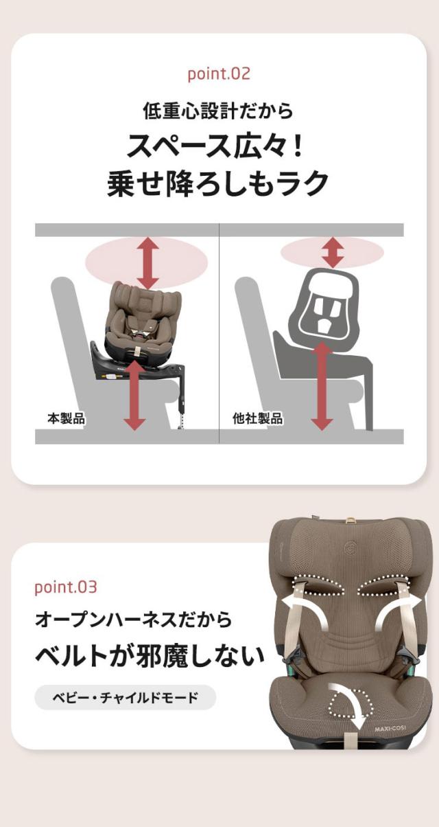 シートの回転とドア側へのシートのスライドに加え、スライド時に左右へ動かせる「スイング」機能を新搭載! 無理のない自然な姿勢のまま、お子様の乗せ降ろしがさらにスムーズになりました。ベースメント一体型なので、別途車載ベースメントを購入する必要もありません。