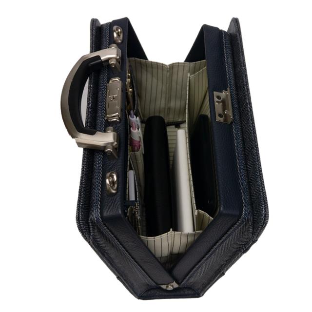 ■中央のパーツをつまむだけでワンタッチで大きく開く口枠式のダレスバッグです。自立するので荷物の出し入れもしやすいシンプルで美しいバッグです。魚の骨のような柄であることからへリンボンと呼ばれるデニムにPUコーティングを施してあります。つるっとした肌さわりで色落ちを防ぎ撥水効果もあります。同系色の革付属が引き締めてくれています。