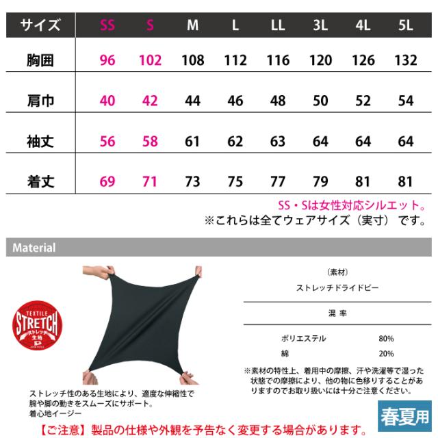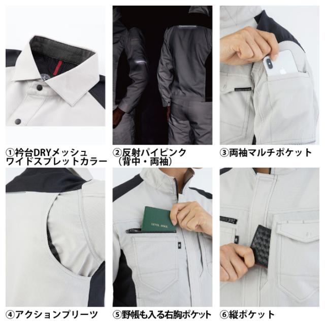 ◇機能:衿台DRYメッシュ、ワイドスプレットカラー、袖マルチポケット、野帳も入る右胸ポケット、反射パイピング(背中・両袖)、アクションプリーツ、縦ポケット