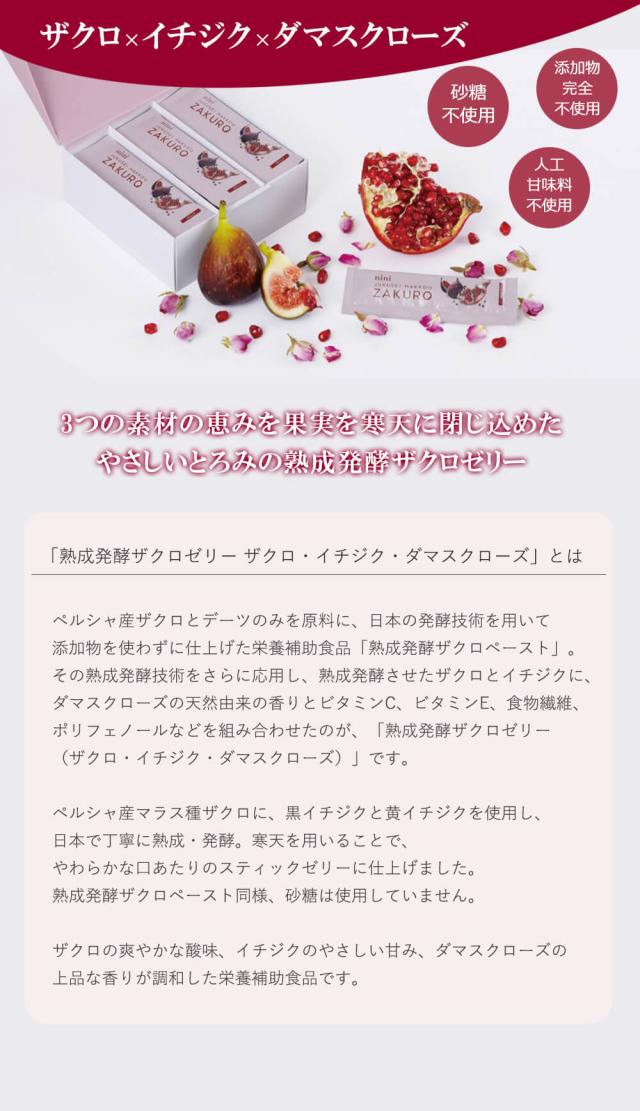 熟成発酵ザクロゼリー ザクロ・イチジク・ダマスクローズ 30包入 熟成発酵させたザクロ×イチジクにダマスクローズの天然香と成分(ビタミンC、ビタミンE、食物繊維、ポリフェノール)を調和させた栄養補助食品。 |
