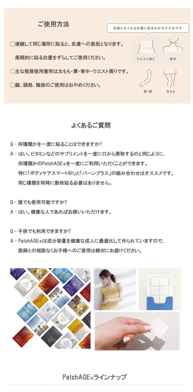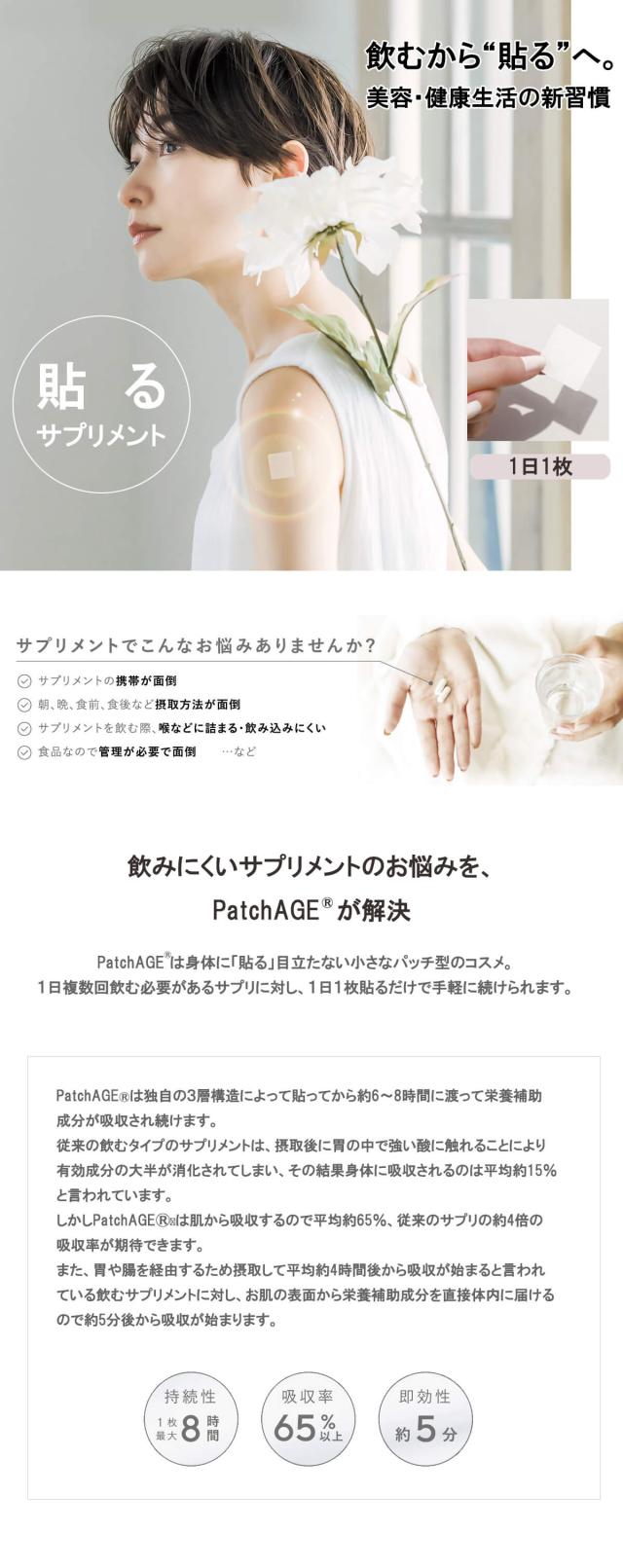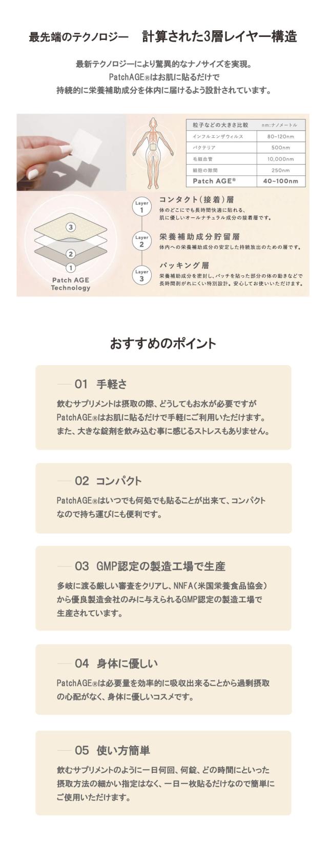 ●PatchAGE®に含まれる成分の容量は健康な成人のみに適しています。