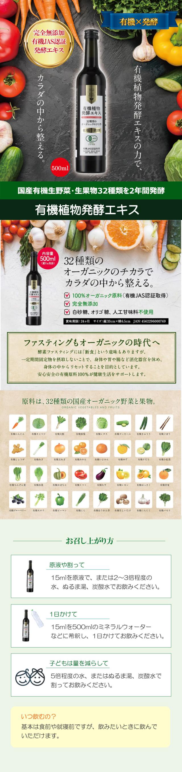 有機植物発酵エキス 500ml 有機JAS認証取得の有機植物発酵エキス(白砂糖、人工甘味料、着色料、酸味料、香料、保存料不使用)以外の栄養素の添加を一切していない100%有機原料を使用。 ファスティングやプチ断食にもおすすめ。 |