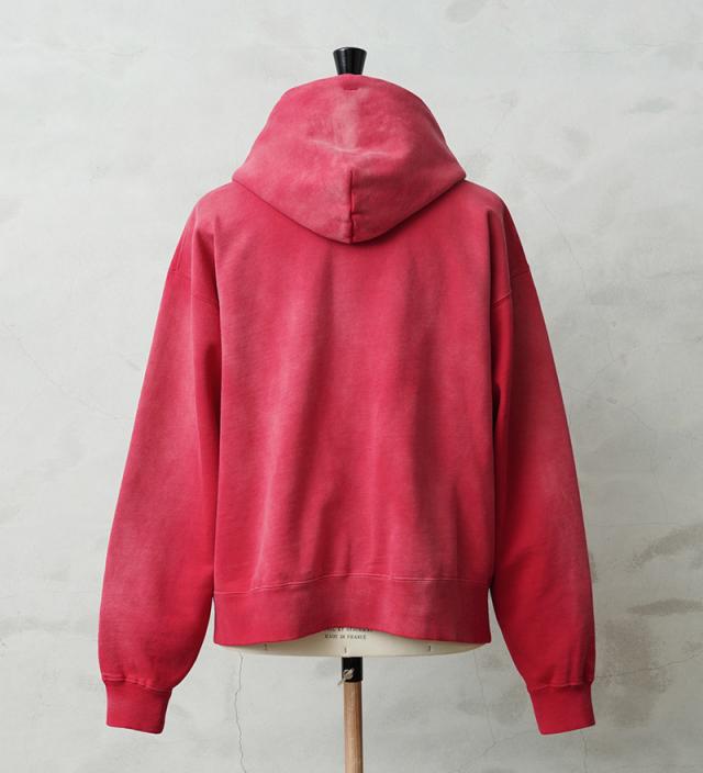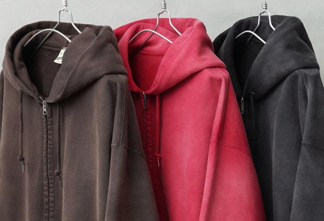 さらに、何度も洗濯と天日干しを繰り返したかのような日焼け加工を施し、長年着込んだような自然な退色感を再現。陽の当たる部分は強く、フード裏や腕の下などの陰になる部分は控えめに加工することで、リアルな経年変化を追求しました。何度もサンプリングを重ね、まるで本物のヴィンテージのような奥行きのある風合いに仕上げています。