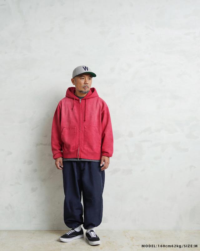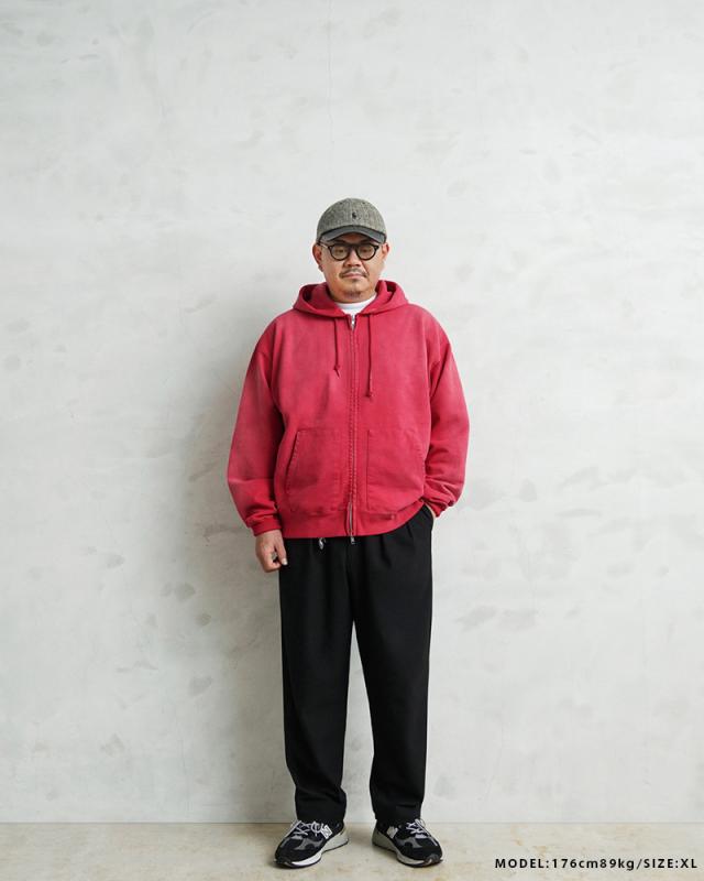 生地には、ヘビーで裏が微起毛したタフなスウェット生地を採用。しっかりとした肉感がありながらも、裏面の微起毛が生み出す柔らかな肌触りで、着込むほどに身体に馴染む仕上がりです。日常使いに耐える耐久性と、快適な着心地を兼ね備えています。