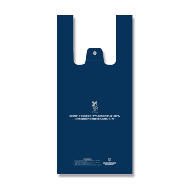 生物由来の有機資源を原料としたバイオマス成分を25%含んだレジ袋です。中身が透けにくい紺色。バイオマスマーク取得済みで、「プラスチック製買物袋有料化制度」の対象外とすることが可能です。主原料のサトウキビは、育成時に光合成をして大気中のCO2を吸収するため、石油化学由来の原料と比較すると大幅なCO2の削減に貢献します。東日本12号/西日本30号に準じた規格となりますが、サイズは若干異なりますのでご注意ください。