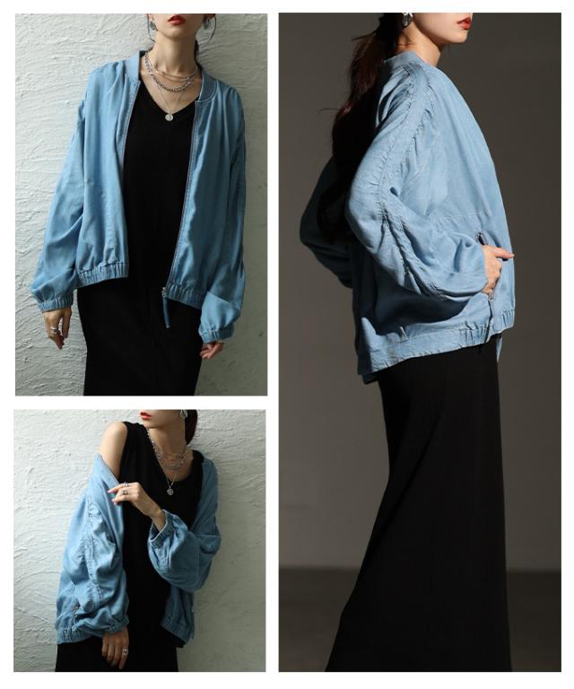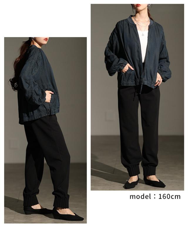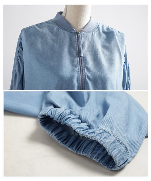 着丈は太腿付け根が隠れるくらいです。袖は親指が隠れるくらいです。脇ぐりも身幅も余裕があり楽に着用できました。裾や背中にゴムが入っていて少し丸みをおびたデザインです。前はジップになっていて軽めのアウターとして活躍しそうです。薄手のやわらかいデニム生地で肌触り良かったです。