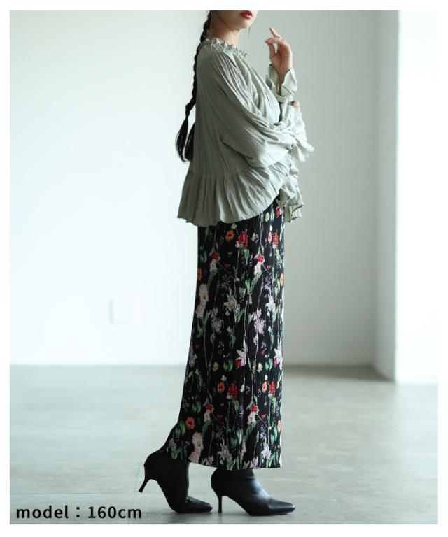 着丈は骨盤が隠れるくらいです。袖は伸ばすと指先が見えるくらいですが袖口から10cm位上にゴムが入っているのでブラウス生地して袖口もフリルのようになりボリューム袖になってかわいいです。脇ぐりも身幅も余裕があり楽に着用できました。骨盤上くらいから切り替わって裾フリルのデザインになってます。透け感のある涼やかなさらりとした生地で着心地良かったです。