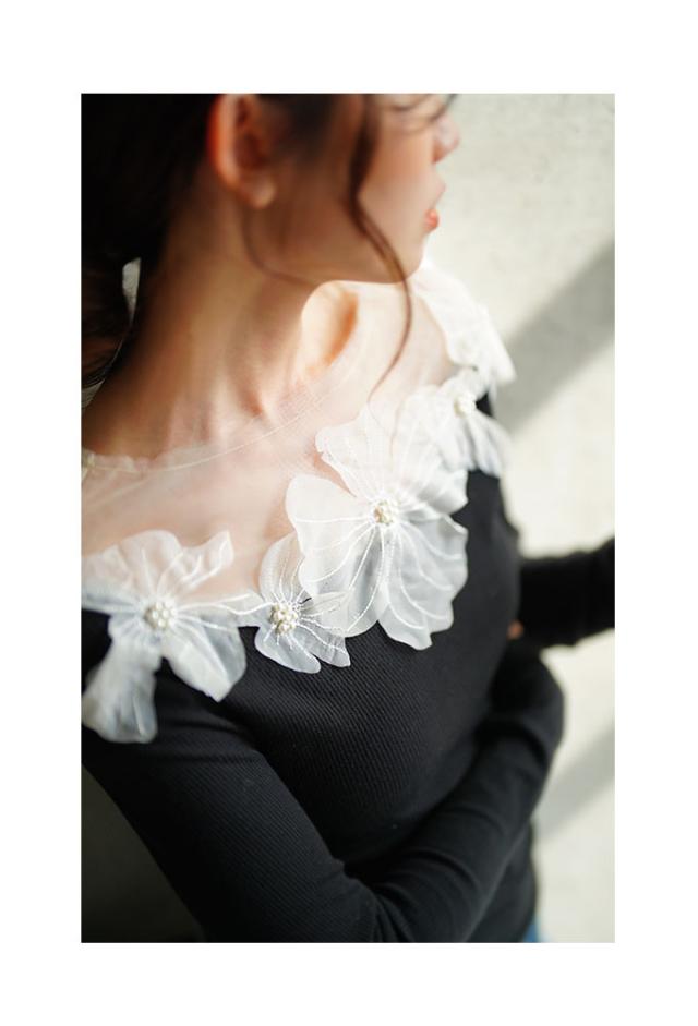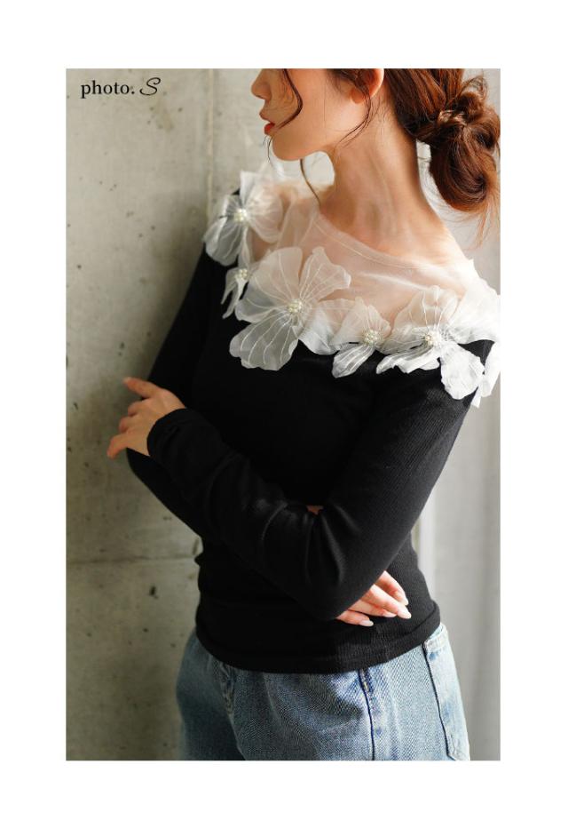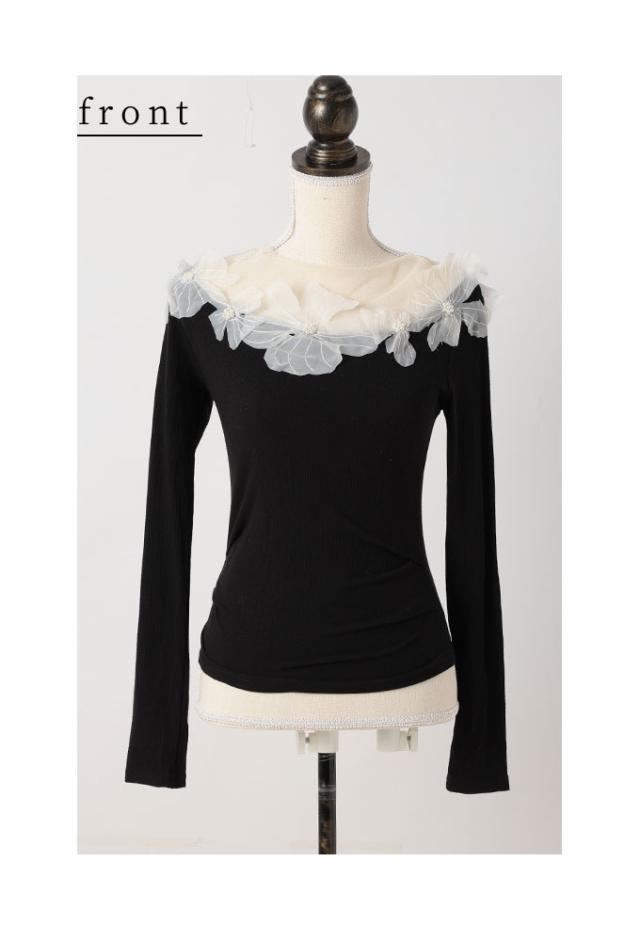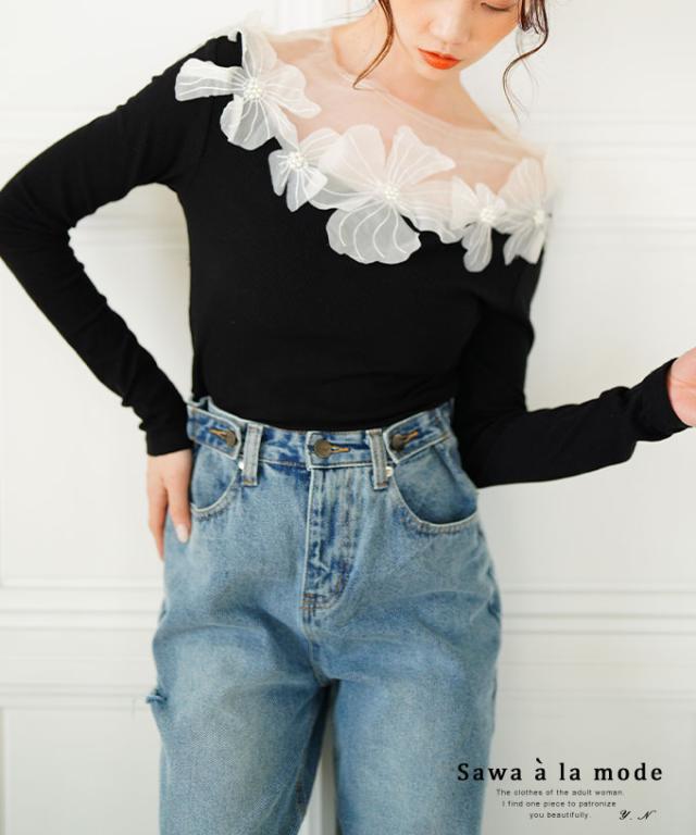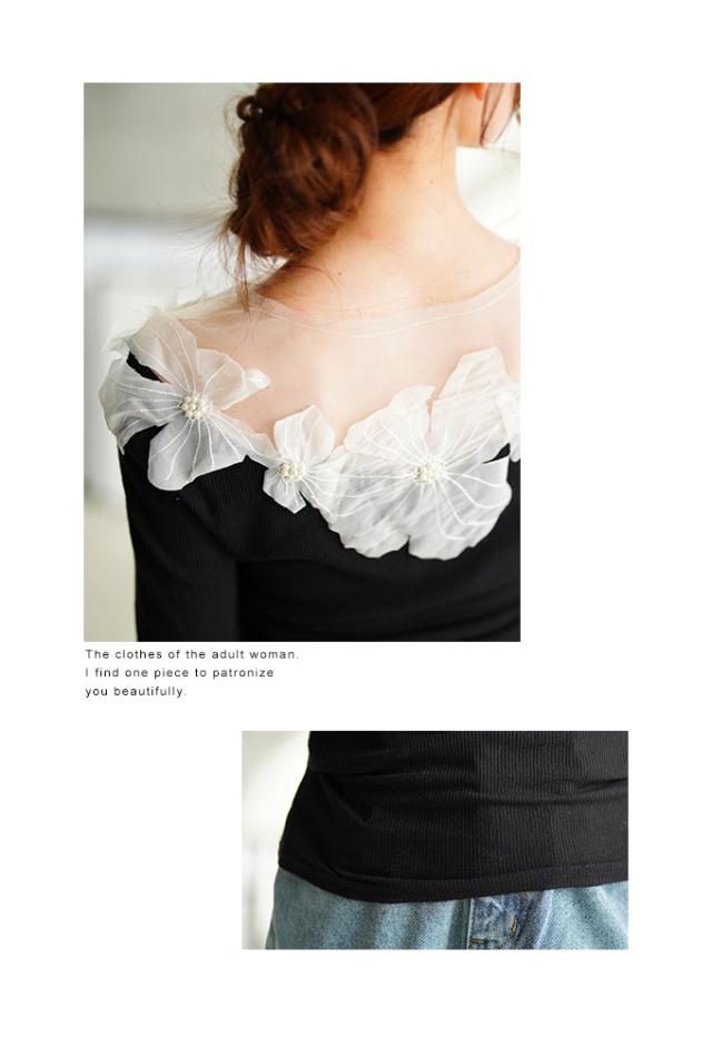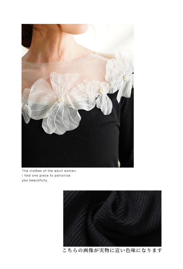 春新作 立体的に浮かび咲くチュールフラワーモチーフリブトップス レディース ファッション トップス カットソー Tシャツ 黒 花 大人可愛い 40代 レディースファッション 50代女性 ファッション 60代 ミセスファッション サワアラモード sawaalamode otona mode-9893