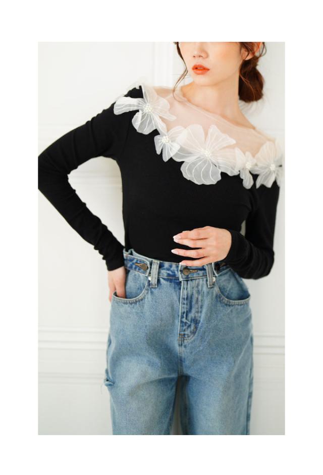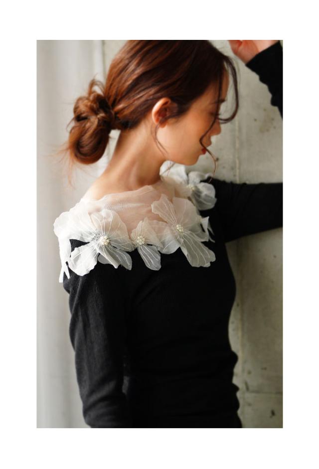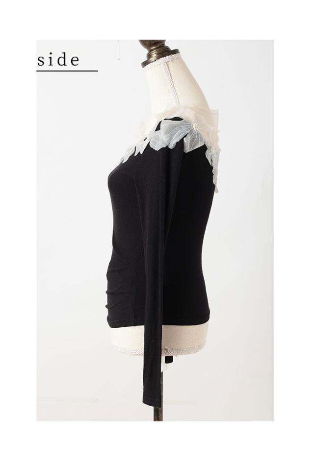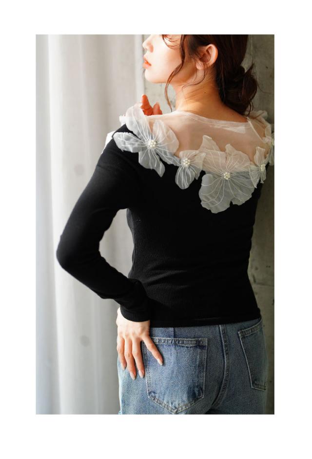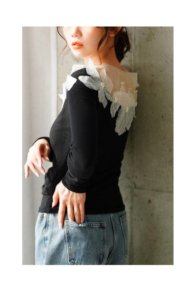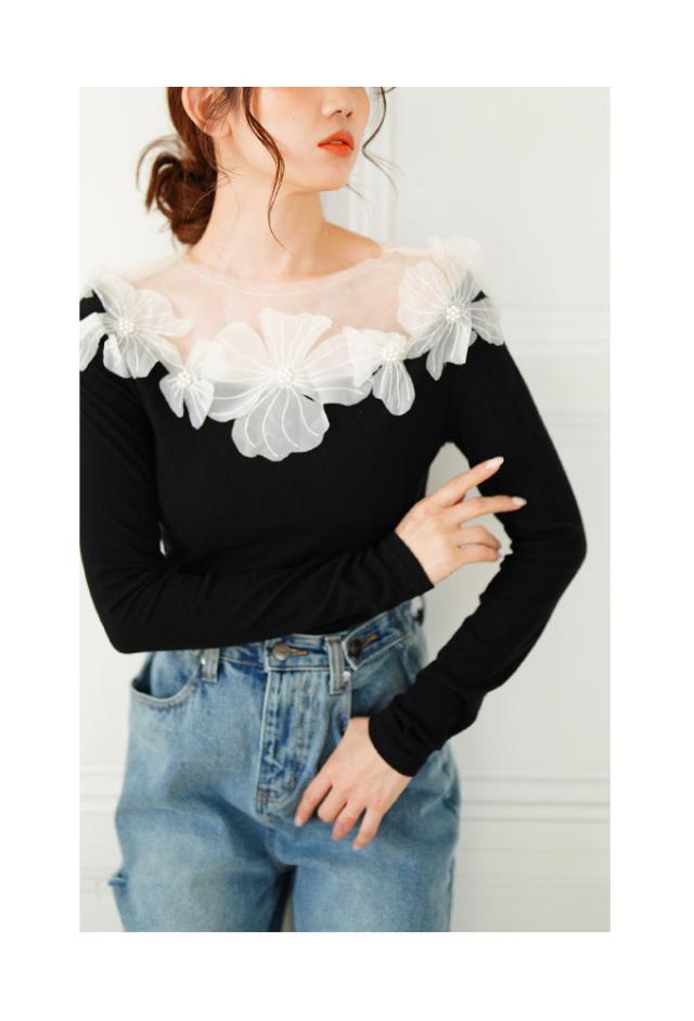 春新作 立体的に浮かび咲くチュールフラワーモチーフリブトップス レディース ファッション トップス カットソー Tシャツ 黒 花 大人可愛い 40代 レディースファッション 50代女性 ファッション 60代 ミセスファッション サワアラモード sawaalamode otona mode-9893