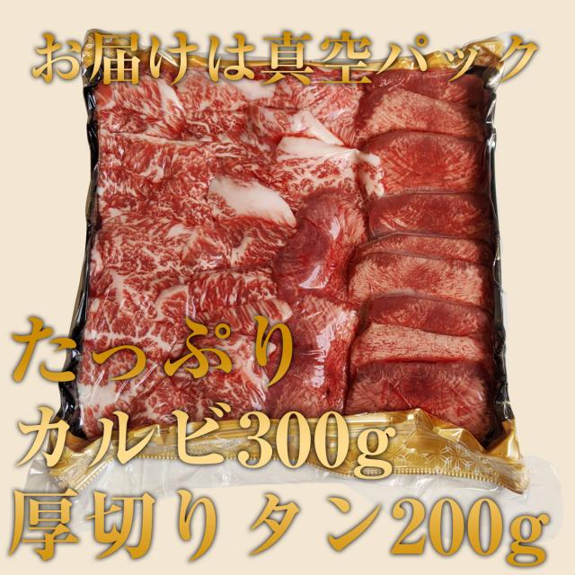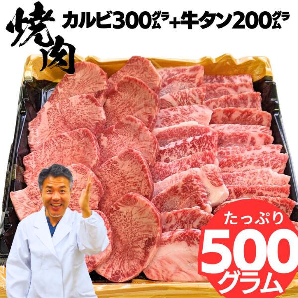焼肉 セット 黒毛 和牛 カルビ 300g + 厚切り 牛タン 塩用 200g 4人前 ~ 5人前 合計 500g 牛 肉 簡易包装 盛り合わせ タレ付き 取り寄せ 高級 焼き肉 ギフト お肉 グルメ 食べ物 誕生日 内祝い お肉バーベキュー bbq
