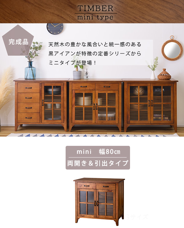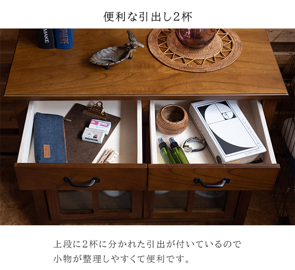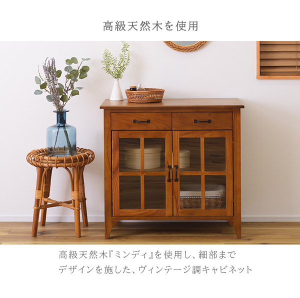 完成品 高級天然木使用 ミニキャビネット 幅80 送料無料 引き出し付き ミニ食器棚 おしゃれ 天然木 木製 木目 コンパクト ロータイプ 両開き ガラス扉 アンティーク レトロ 小さい 小さめ ローキャビネット 扉付き 脚付き ヴィンテージ ミンディ