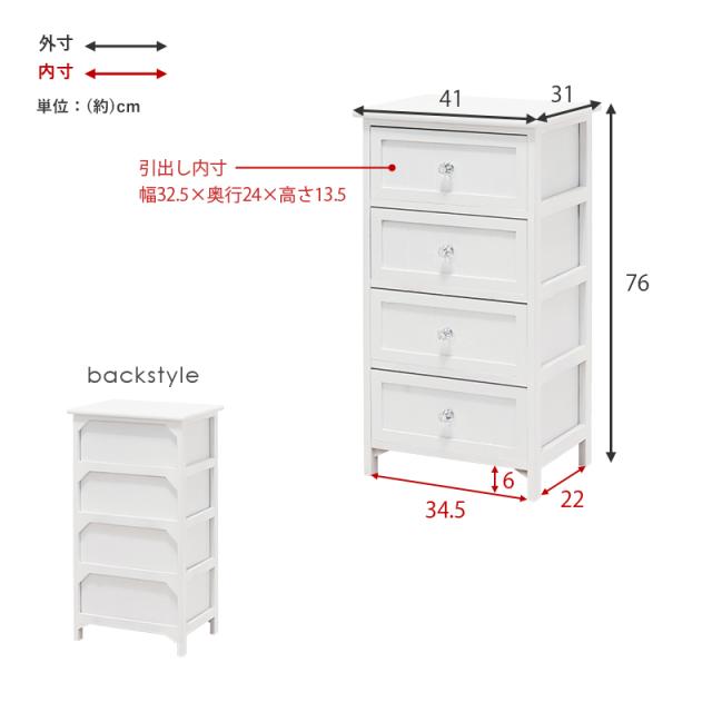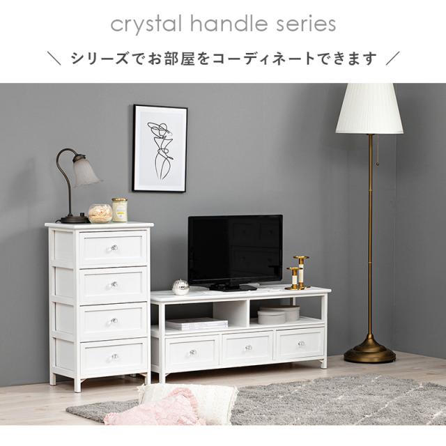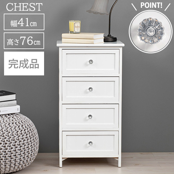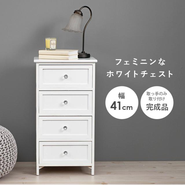 完成品 クリスタル取っ手が可愛い 木製 ホワイトチェスト 4段引き出し 幅41 【送料無料】 ローチェスト コンパクト タンス おしゃれ ホワイト 白 桐 軽量 引き出し 収納 小物 木製 アンティーク かわいい 姫系 インテリア 家具 天然木 スリム