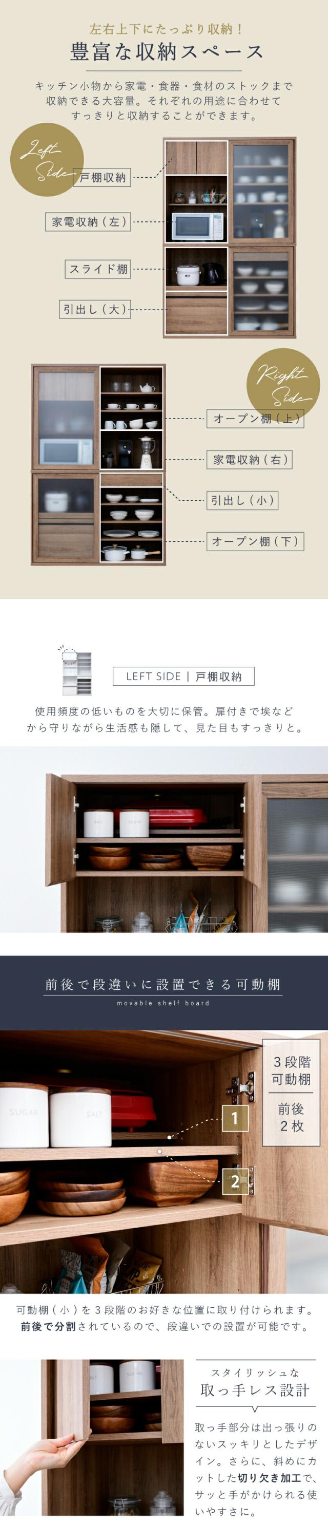 - スライドで家電収納できる食器棚をさがしていて、やっとこれだというものを見つけました。上下別でスライドできるとのことで使い勝手が良さそう、しっかりした造りそう、ホワイト鏡面仕上げ、サイズもおそらく問題なしです、後は組み立てが心配な所。沖縄ですが送料も無料!(込み!)と大変ありがたい商品で楽しみです! レンジ、炊飯器、お米なども収納する予定で、床に置いたりしてごちゃつきがまとまる、と楽しみです!