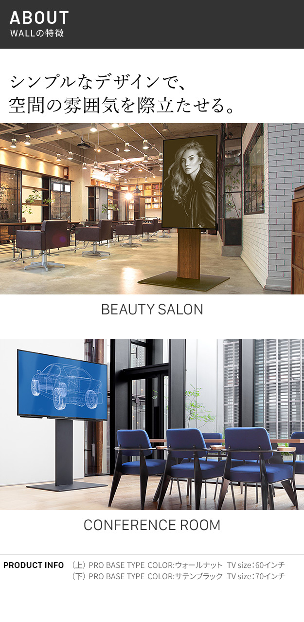【キーワード】 壁寄せテレビスタンド 会議室 大型 法人 デジタルサイネージ モニタースタンド おしゃれ 安い 激安 ホワイト 黒 ウォールナット ウォルナット ブラック 白 おすすめ 展示会 モニターラック 80型 80インチ テレビ台 壁掛け テレビボード WALL ウォール プロ PRO