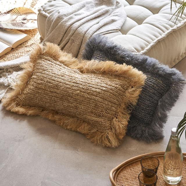 クッションカバー 天然素材 長方形 天然素材 ヤシ ラフィア フリンジ オールシーズン カバーのみ 椰子 カバーのみ グレー おしゃれ カバー クッション 模様替え ヤシの葉 クッション用カバー 店舗 カフェ レストラン サロン スパ 13879-a
