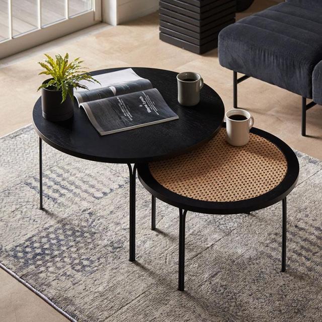 ブラックウッド×ラタンメッシュの天然素材を使用した、高級感とシンプルモダンな雰囲気漂うネストテーブル。人気のオーク材の木目を綺麗に活かし、職人がひとつひとつ手作業で塗装した空間を引き締めるブラックカラーが魅力。直径55cm(S)と70cm(L)の組みあわせ。二つ並べて広めのセンターテーブルとしてはもちろん、Sサイズはサイドテーブルやディスプレイ台として使ったりと、好きな場所で自由なレイアウトを楽しむことができます。