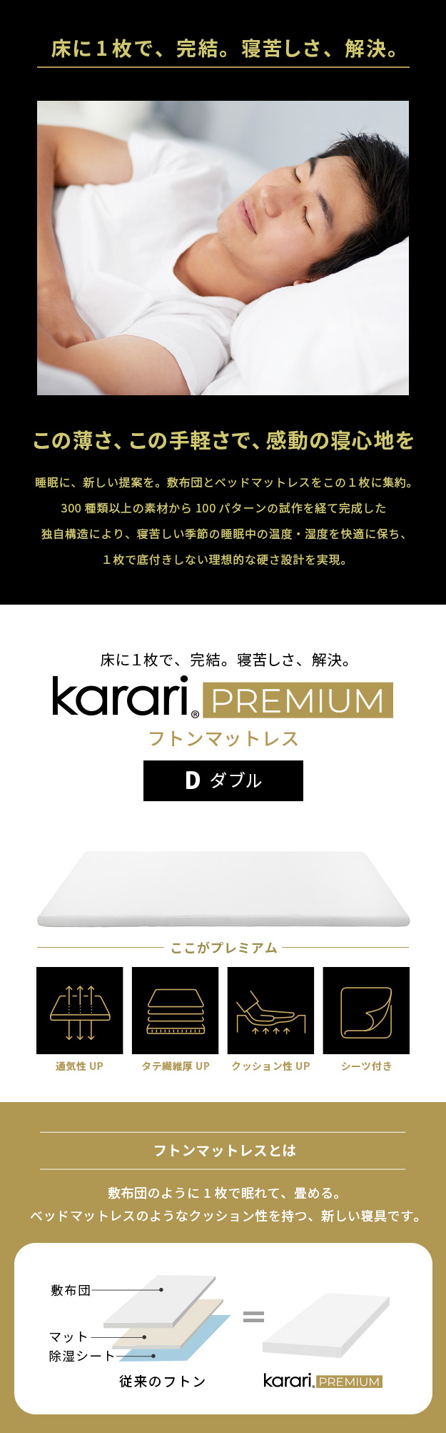 敷布団 敷き布団 マットレス フトンマットレス karari PREMIUM カラリプレミアム ダブル D 高級リネンシーツ付き 5層構造 除湿 通気性 極厚 硬め クッション性 部屋干し カビ防止
