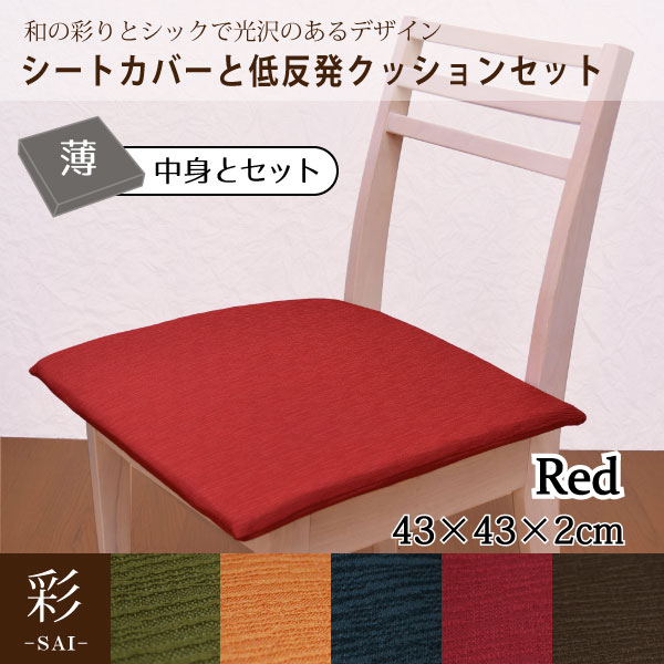 カバー&中身セット クッション 低反発ウレタン 在宅勤務 シートクッション レッド 彩 紬風生地 2cm 厚 カバーセット 43×43×2cm 薄タイプ