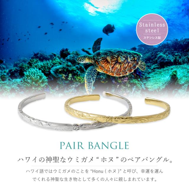 ハワイの神聖なウミガメ“ホヌ”のペアバングルです。素材には金属アレルギーに配慮したサージカルステンレス316Lを使用しています。 ペンダント裏面には名前や日付、メッセージなど無料で刻印をお入れすることができるので、誕生日、記念日、クリスマス、ホワイトデーなど特別なギフトにおすすめです。【ペアセット商品】