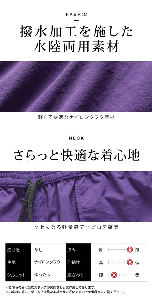 素材は、夏でも快適に穿ける厚みと軽量感が人気のナイロンタフタ。表面にツヤとシャリシャリ感があるおしゃれな生地です。撥水加工を施しているので、街穿きや水辺での使用も可能です。