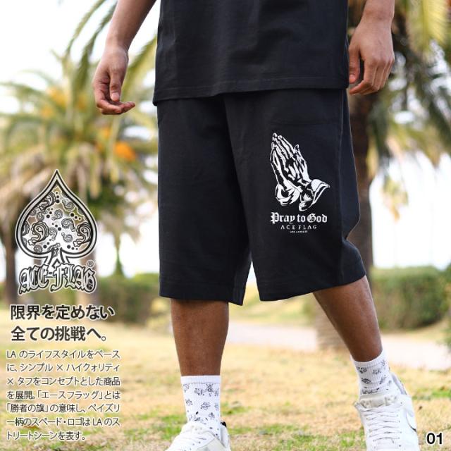 ACEFLAG ハーフパンツ スウェット 裏パイル メンズ 黒/白 大きいサイズ エースフラッグ 短パン 半ズボン ショートパンツ ゆったり おしゃれ 十字架 クロス 2フェイス ロゴ b系 ヒップホップ ダンス 夏 AF-HP-SW-021