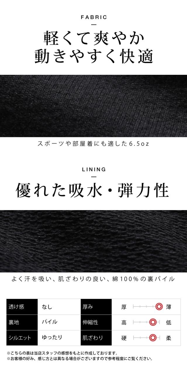 肌触りがよく吸汗性に優れたミニ裏パイル仕様。毛玉ができにくい綿100%。