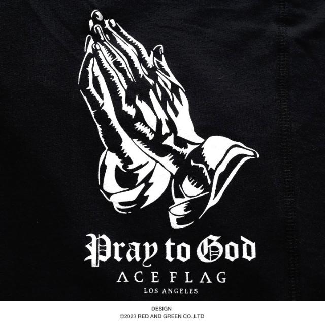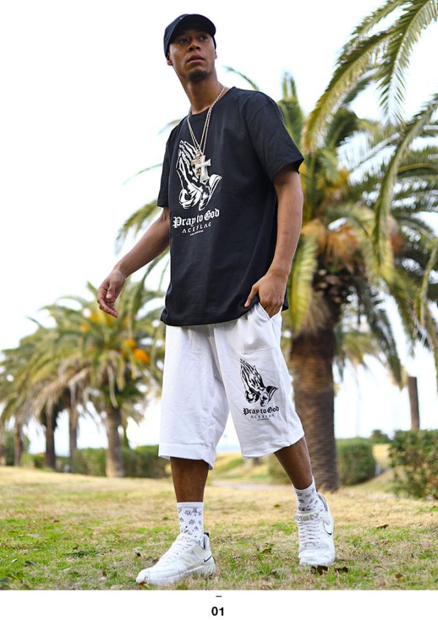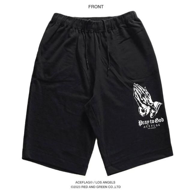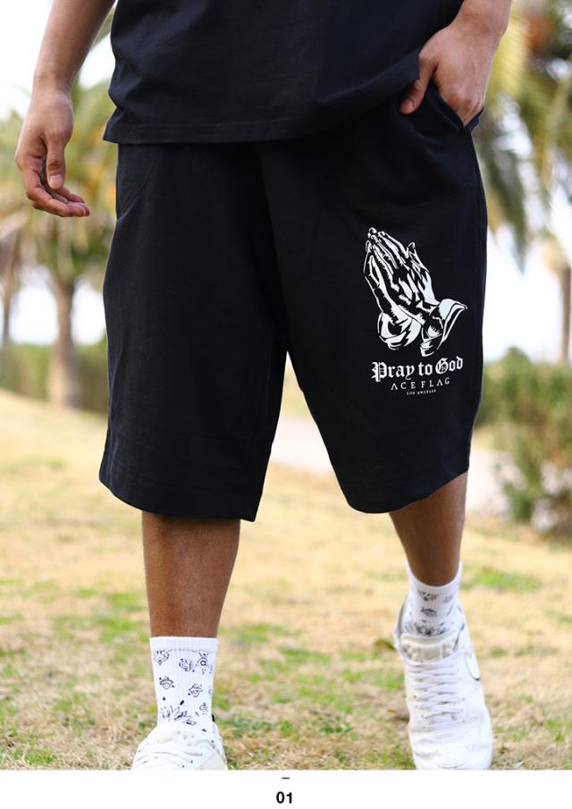 Praying Handsと共に、LAtimes風のオールド文字で「Pray to God/神に祈る」ロゴをドロップした、スウェットハーフパンツ。