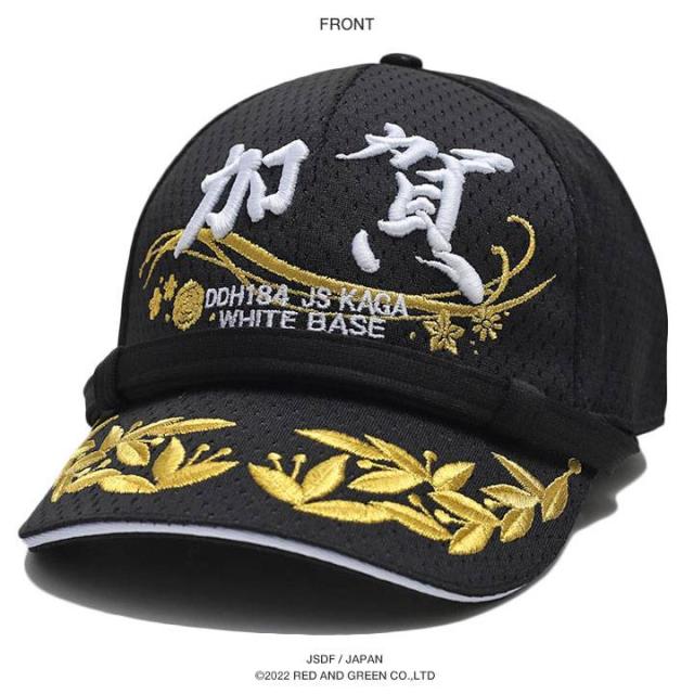 正面に、3D立体の白糸刺繍で漢字表記の「加賀」、2D刺繍で英艦名の「JS KAGA/DDH184」と加賀の名山の白山をさす「WHITE BASE」、金糸刺繍で日本を代表する「四季の花々」と「蔦(ツタ)」、バックパネルにはDDH184のアーチロゴ刺繍入り。