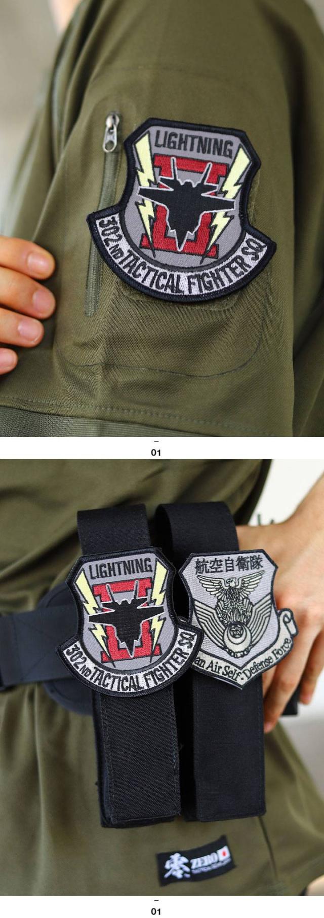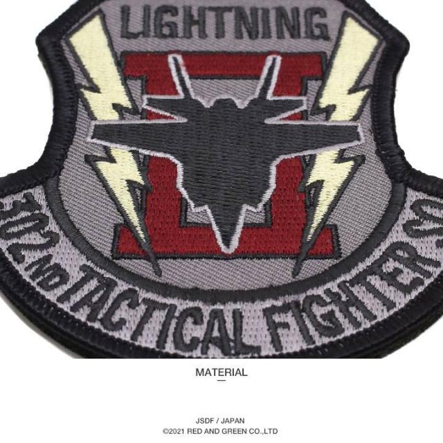部隊マーク (エンブレム)は、F-35戦闘機のシルエットデザインを中央に配置し、両サイドの稲妻とローマ数字の2で「ライトニング 2」を表しています。隊員さんが右胸に付けているメインパッチのデザインです。