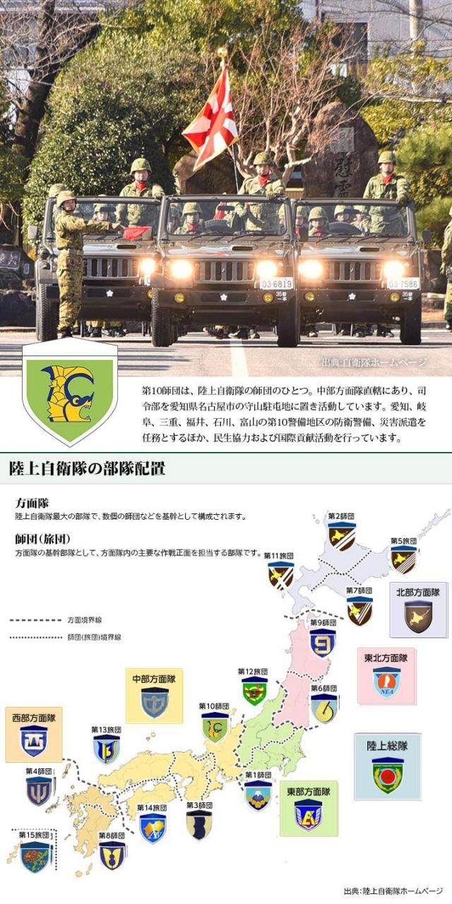 3個普通科連隊を基幹とし、第10警備地区(愛知、岐阜、三重、福井、石川、富山)の防衛警備、災害派遣を任務とするほか、国際貢献活動・民生協力を行っています。