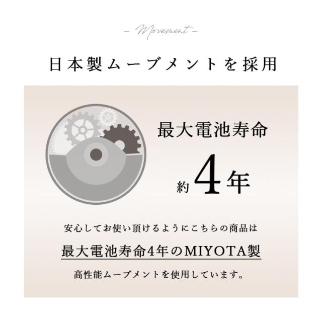 日本製の高品質ムーブメントを使用しており、バッテリーの寿命が最大約4年間なのも嬉しいポイント。