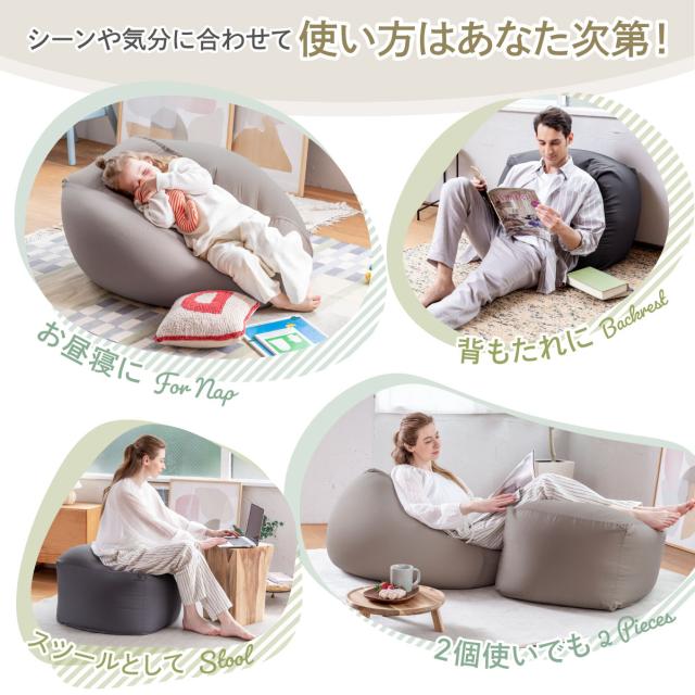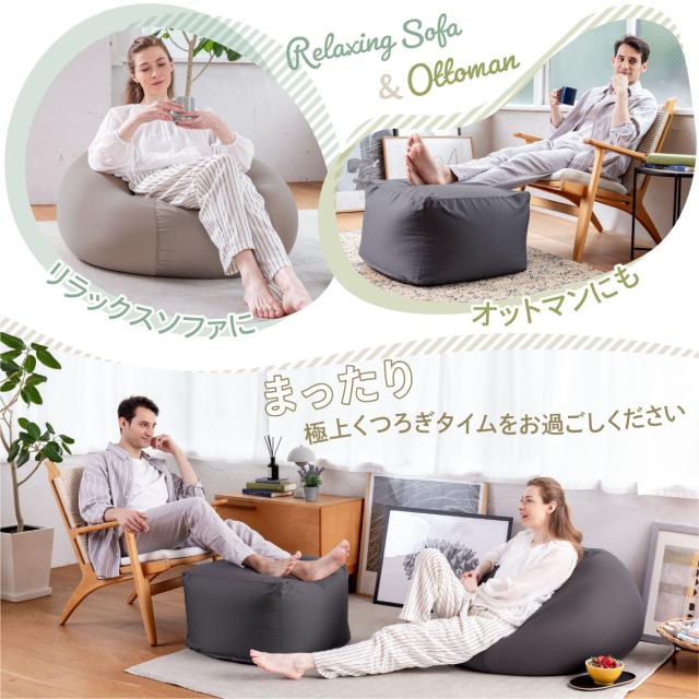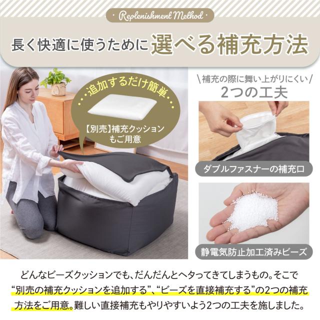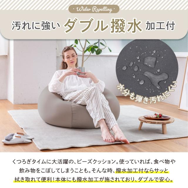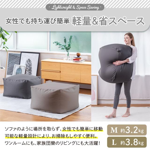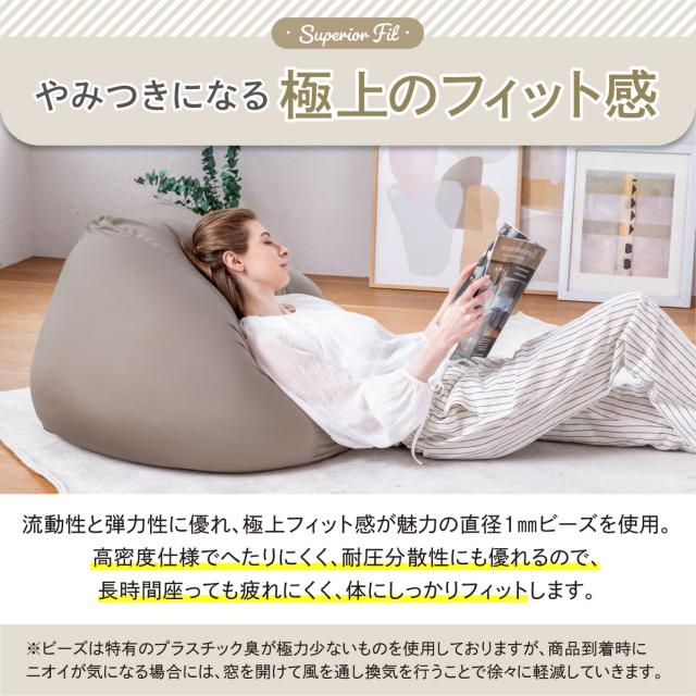 【極上フィット感のビーズクッション】流動性と弾力性に優れた約1mmビーズを使用。高耐久ツイル生地は、撥水加工付きでも柔らかく体にフィット。【撥水加工で食べこぼしも安心】「撥水加工付きカバー」なら、さっと拭き取り便利できれい!【取り外し可能なカバー 洗濯OK】【使い方自由自在】背もたれ用、お昼寝用、スツール、リラックスソファー、オットマン、2個使い等、シーンや気分に合わせて使い方を選ばないのが魅力。【商品サイズ】●サイズ:Mサイズ 約55x55x35cm●色:チャコールグレー/グレージュ●カバー生地/上下ニット生地:ポリエステル89%ポリウレタン11%、四周生地:綿35%ポリエステル65%(撥水加工)●本体生地:ポリエステル89%ポリウレタン11%(撥水加工)●中材:ポリエチレンビーズ1mm(静電気防止加工)●商品重量:3200g●付属品:保証書付き取扱い説明書●生産国:日本企業開発/イタリアデザイン/中国専用工場生産 ※2023年7月現在、補充用1mmビーズのみの販売は行っておりません。補充用クッションは販売しております。※こちらの商品は「本体+カバー」のセット商品です。届いたらすぐにそのままお使い頂けます。