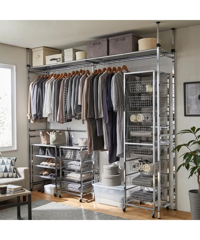 クロームメッキとシルバーメタリック仕上げのクローゼットハンガーシリーズ。縦にも横にも伸縮するクローゼットハンガーに加え、チェストとラックも組み合わせれば小物類の収納も可能!空きを残さず、空間を有効活用できます。奥行きがスリムでウォークインクローゼットや納戸にも設置できます!!