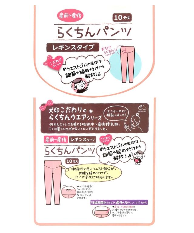 先輩ママ御用達! マタニティの老舗メーカー「犬印本舗」がモニターママと検証して作った、こだわりのらくちんウェアシリーズ 何かとストレスを感じやすい妊娠中〜産後の授乳期。 ウエストゴムの面倒な調節や締め付けから解放してくれる、伸縮性のあるウエストがポイントです! また、ウエスト部分を折り返すと産後もはけるのもうれしいポイント ・妊娠初期〜産後に使う ・オールシーズン素材