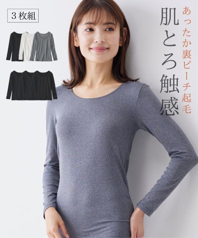 大きいサイズ レディース 裏ピーチ起毛 丸首 長袖 インナー 3枚組 肌着 黒+オフホワイト+チャコールグレー杢/黒3枚組 3L/4L/5L/6L ニッセン nissen