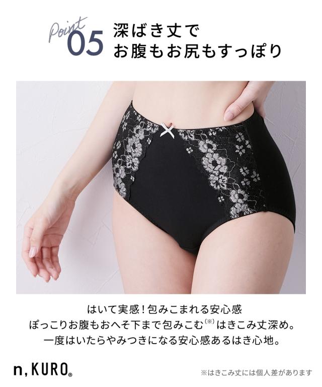 [keyword] レディース 下着 ランジェリー インナー 大きいサイズ ぽっちゃり ふくよか プラスサイズ ラージ ファッション 標準サイズ 普通サイズ ゆったりサイズ ハイウエスト すっぽり 深め 深ばき丈 深履き丈 レース付き レーシー ストレッチ 伸びる 綿混 コットン混 綿素材 綿 コットン お買い得セット まとめ買い セット お得 春 夏 秋 冬 [comment] ●○●黒好きさんのための「n,kuro」シリーズ●○●お買い得セットに要らない色が含まれている事、ありませんか?黒好きさんの黒だけのショーツn,kuro(エヌクロ)なら、ベースカラーはすべて黒。黒だけだから色で悩まない!黒でもデザインは豊富!配色のレースを施すことで、シックな大人っぽいデザインに。■おへそまですっぽり(※)の深ばきタイプはきこみ丈が深めでぽっこりお腹も包みこんで安心感のあるはき心地。※はきこみ丈には個人差があります■綿混素材でお肌にやさしい肌ざわり身生地は綿たっぷり綿95%(※ゴムやレース部を除く)優しく伸びて心地よくヒップにフィットします。■クロッチ裏は綿100%でさらに肌ざわりやさしくクロッチ裏は綿100%生地を重ね、通気性もありムレにくい。デリケートな部分にも優しさを。■2wayス