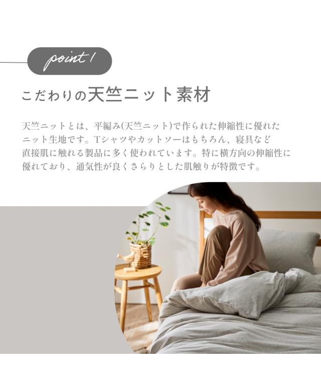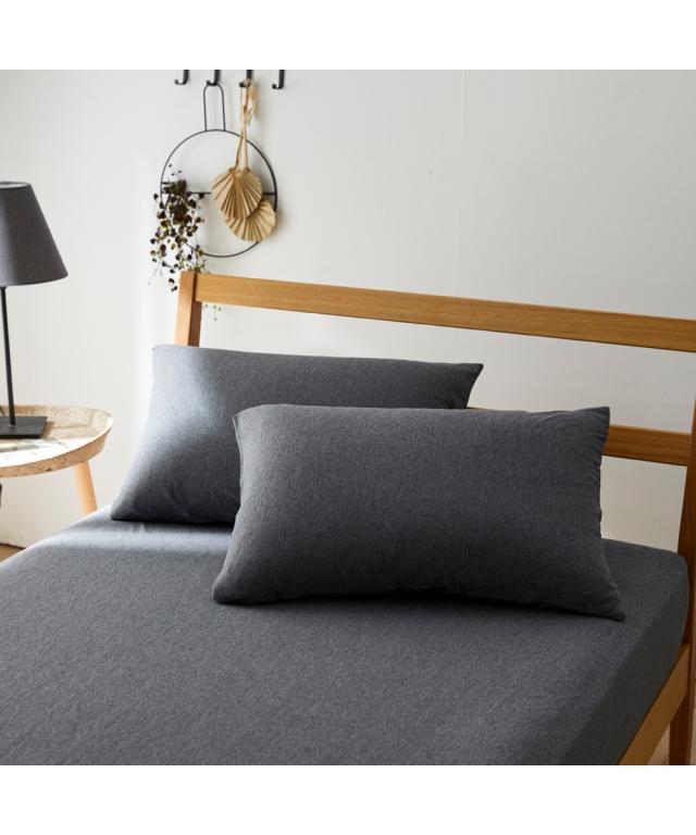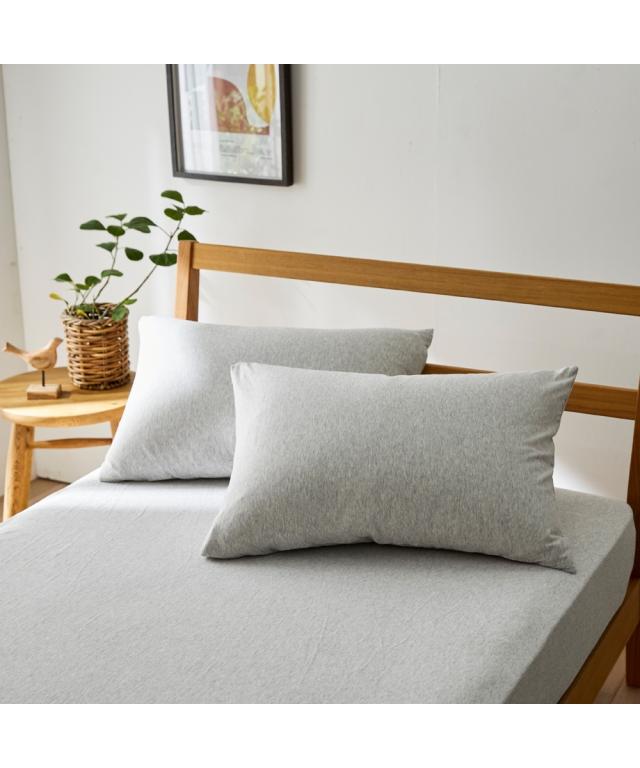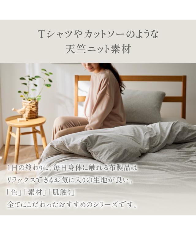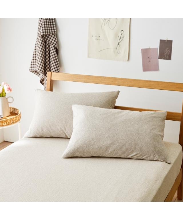着心地のいいTシャツ生地の布団カバーがあったらな・・・そんな思いから生まれたカットソーに使う天竺ニットの枕カバー。肌にあたる部分は綿100%を使用して、やさしい肌ざわりにこだわりました。やわらかな風合いに仕上がり、色合いも杢調な所も寝室に馴染み◎