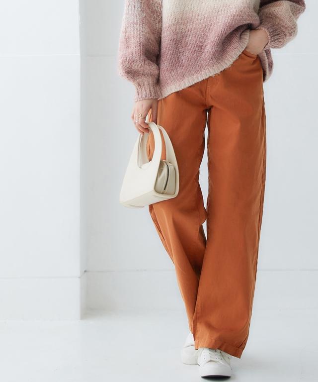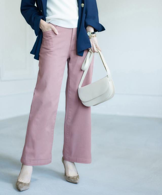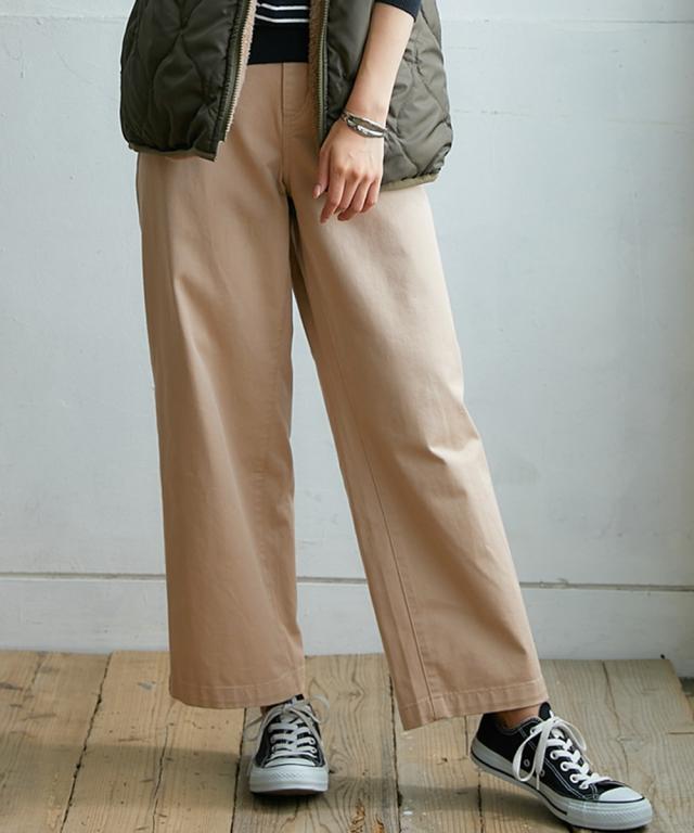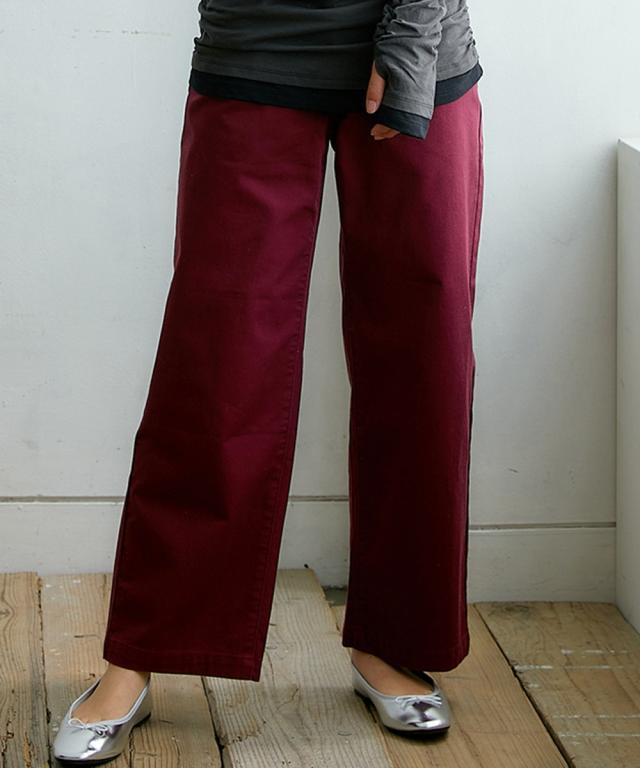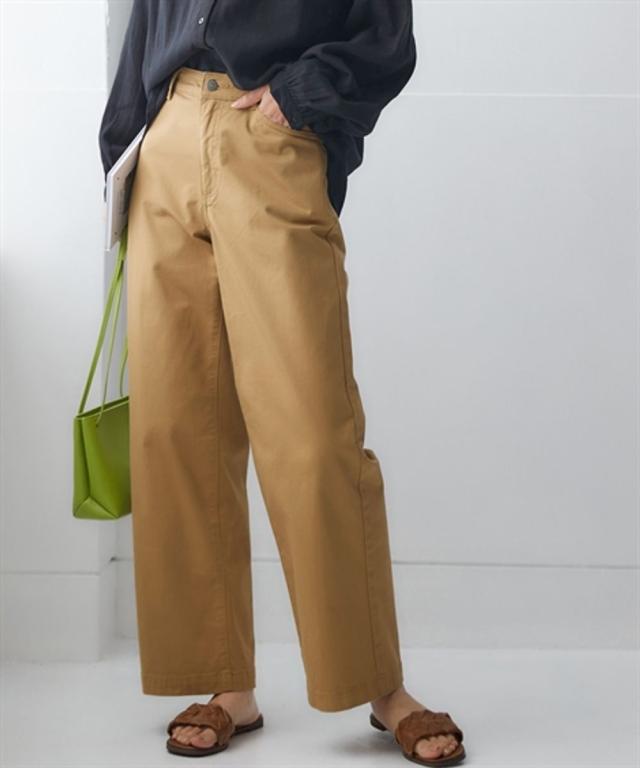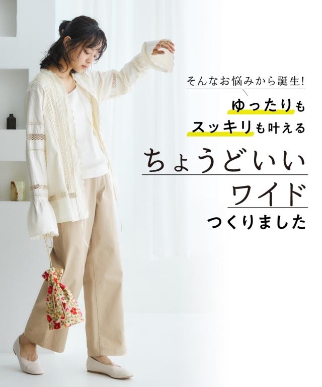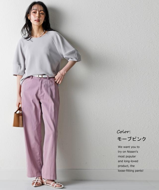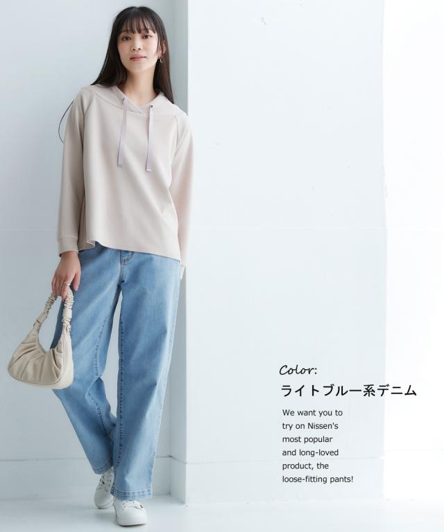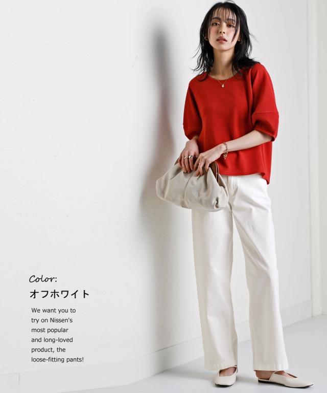 品質:[ゆるフィットワイドパンツ]品質=綿95%・ポリウレタン5% (織物 ツイル) [ゆるフィットワイドデニムパンツ]品質=綿75%・ポリエステル20%・ポリウレタン5% または綿80%・ポリエステル15%・ポリウレタン5% (織物 デニム8.5オンス) 前ボタン・前ファスナー開き・使用可能ベルト幅約4cm 透け感:やや透ける ※色によって透け感が異なる場合があります。淡色カラーはベージュ系インナー着用をおすすめします 伸縮性:ややあり 生地の厚み:普通 光沢感:なし 裏地:なし ポケット:あり ※前